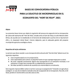 Las presentes bases tienen por objeto la regulación del proceso de asignación de las microparcelas de cultivo del ecohuerto del “Hort de Felip”, situado entre el Camí de Felip y la calle Mariano Soler Olmos, de acuerdo con lo establecido en el Convenio de Colaboración suscrito entre el Ajuntament d’Elx y la Associació Veïnal Raval i Carrers Adjacents, para la adecuada gestión del proyecto municipal de agricultura ecológica urbana.