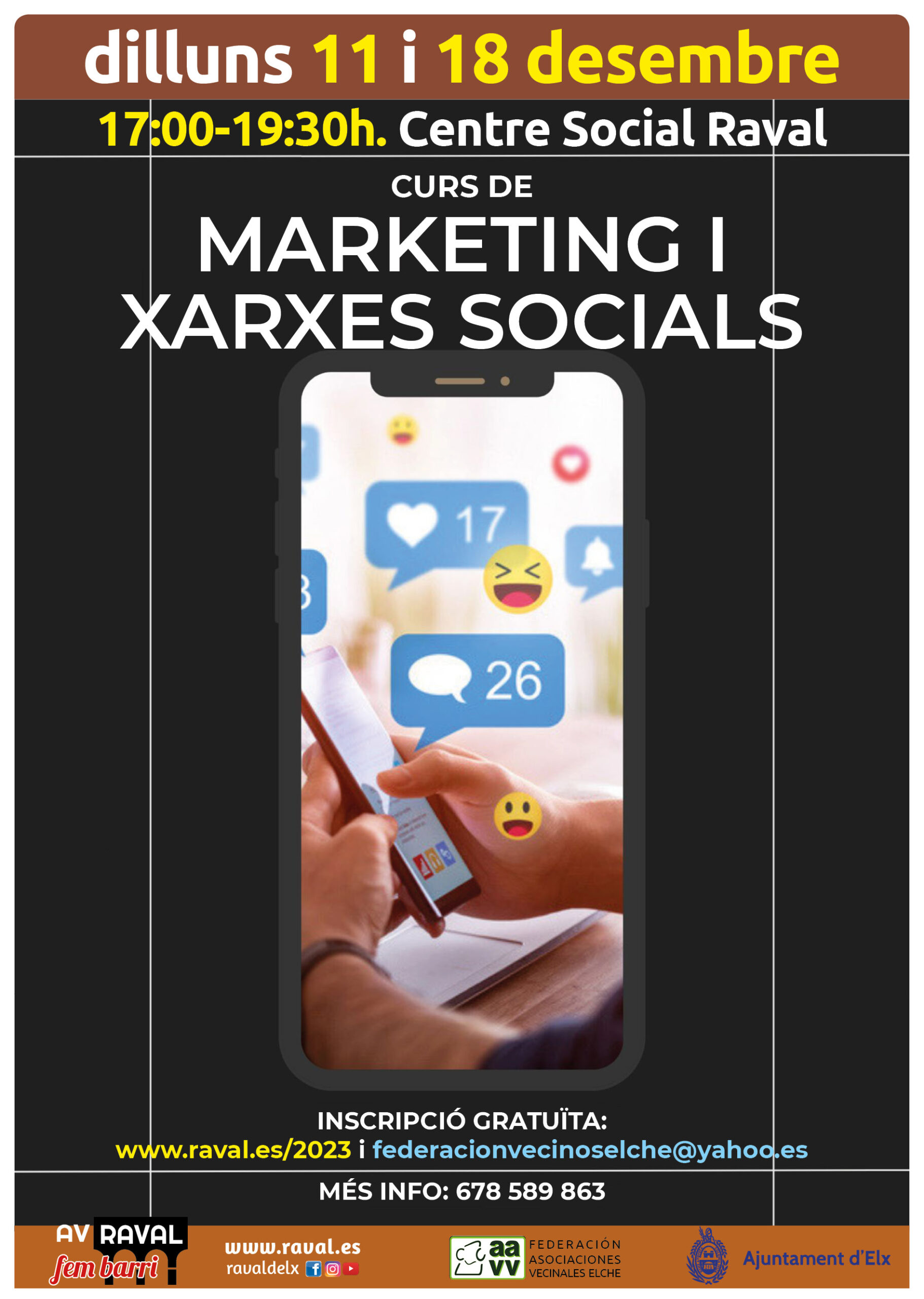 La Federació d’Associacions Veïnals d’Elx convoca aquest curs gratuït per conèixer més i millor les ferramentes de marketing i la gestió de les xarxes socials, el dilluns 11 i 18 a les 17:00h. en la segona planta del Centre Social del Raval